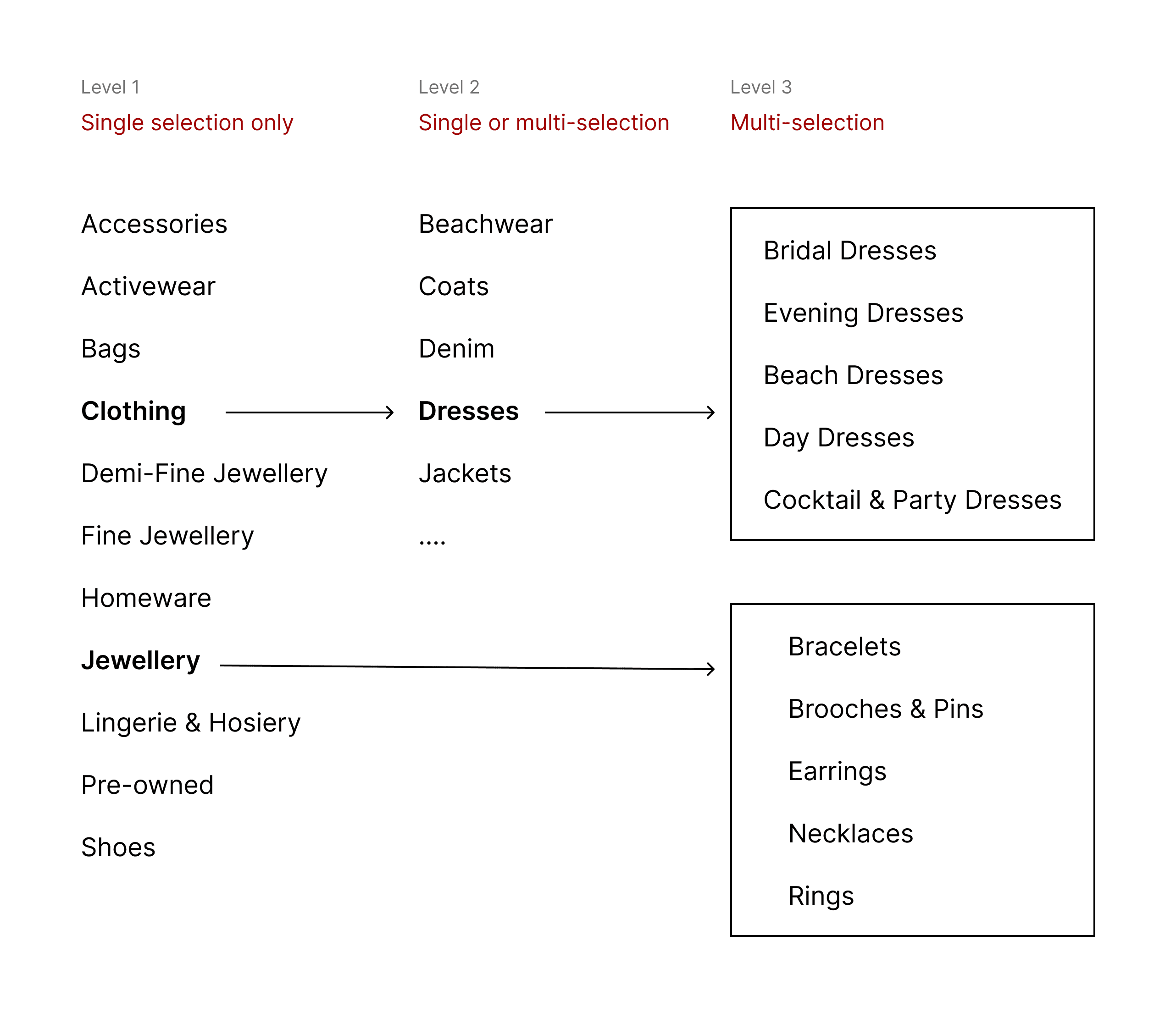 For example: "Clothing" and "Jewellery" are on the same category level, but "Clothing" has two subcategories where "Jewellery" only has one .