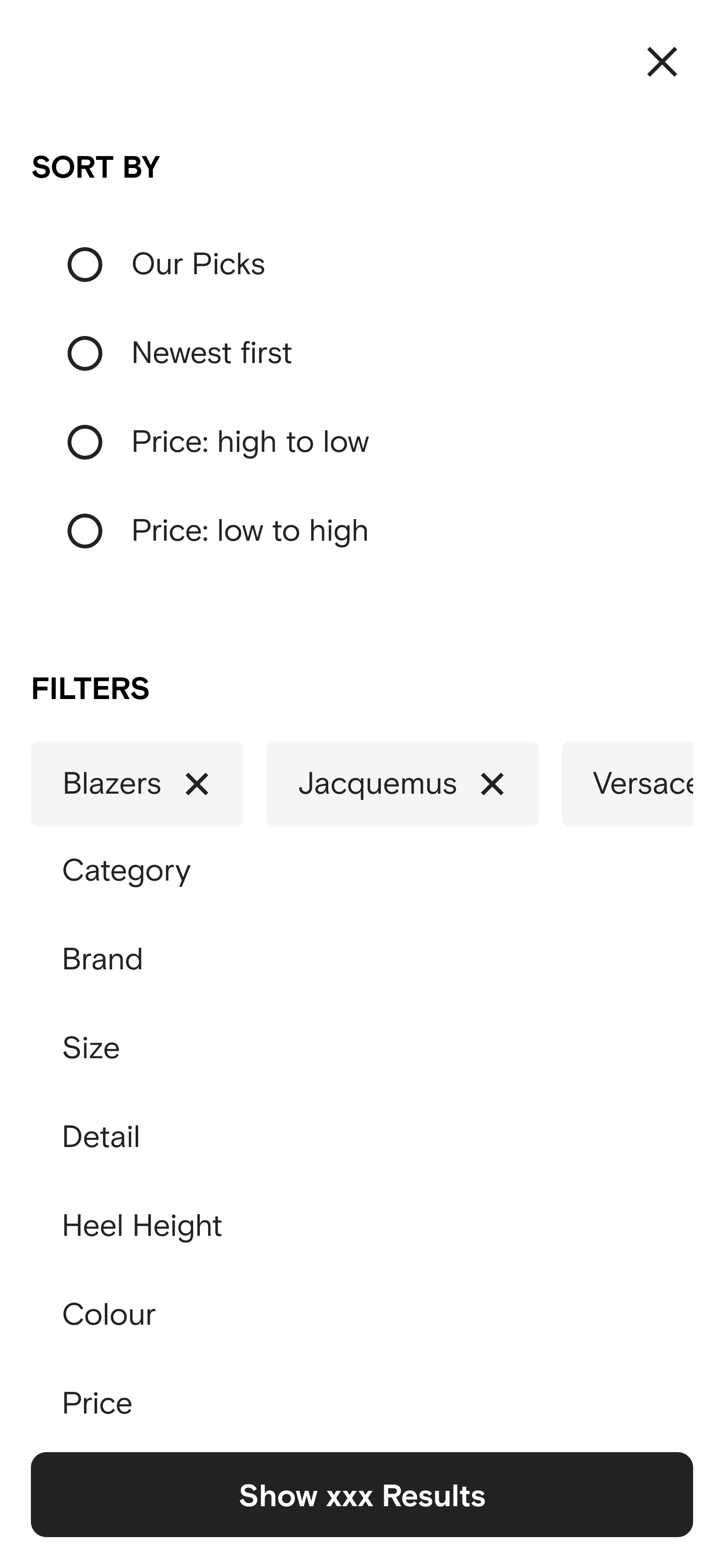 After rolling out first iteration, we identified some inconsistencies in the components of our design system, and the desired solution was not technically feasible. Therefore, I proposed a UI iteration to align the experience across PLP filter journey —removed the checkbox in the filter chips — which is now live at Farfetch.com.