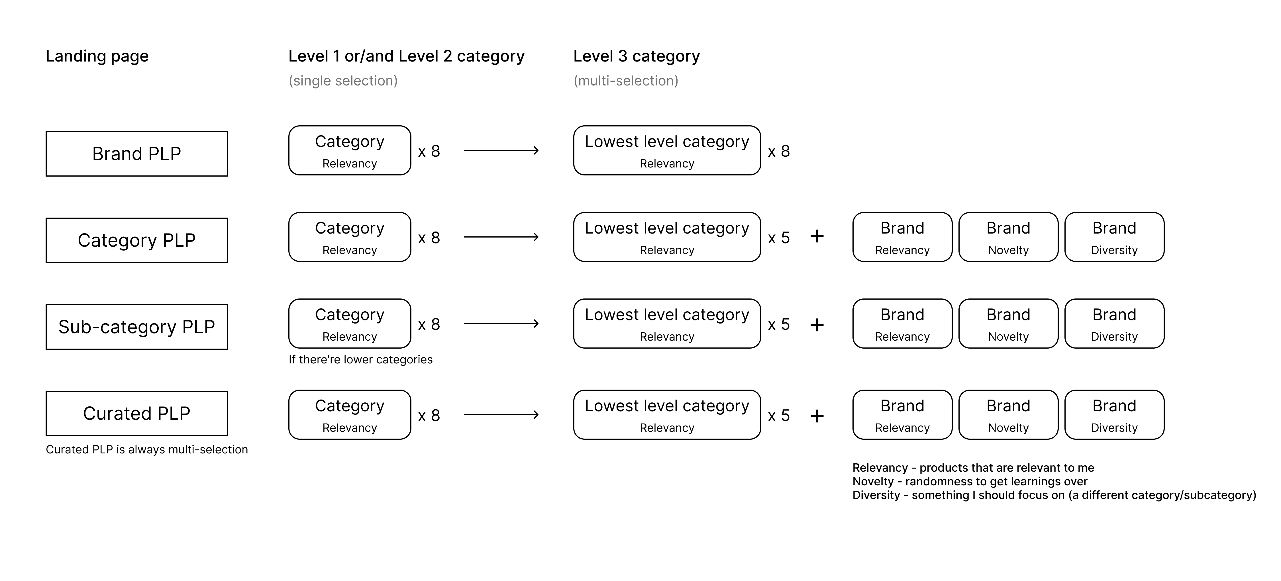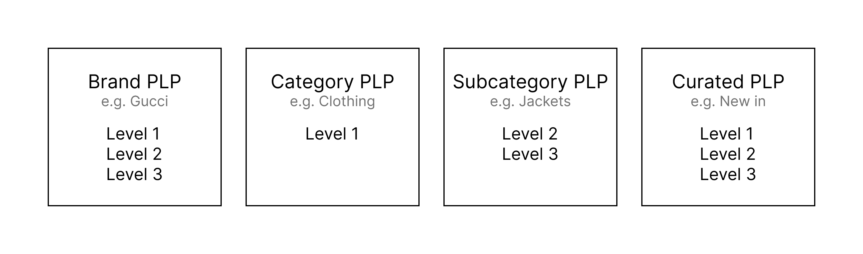 How different category levels sit in four types of Product Listing Page (PLP)