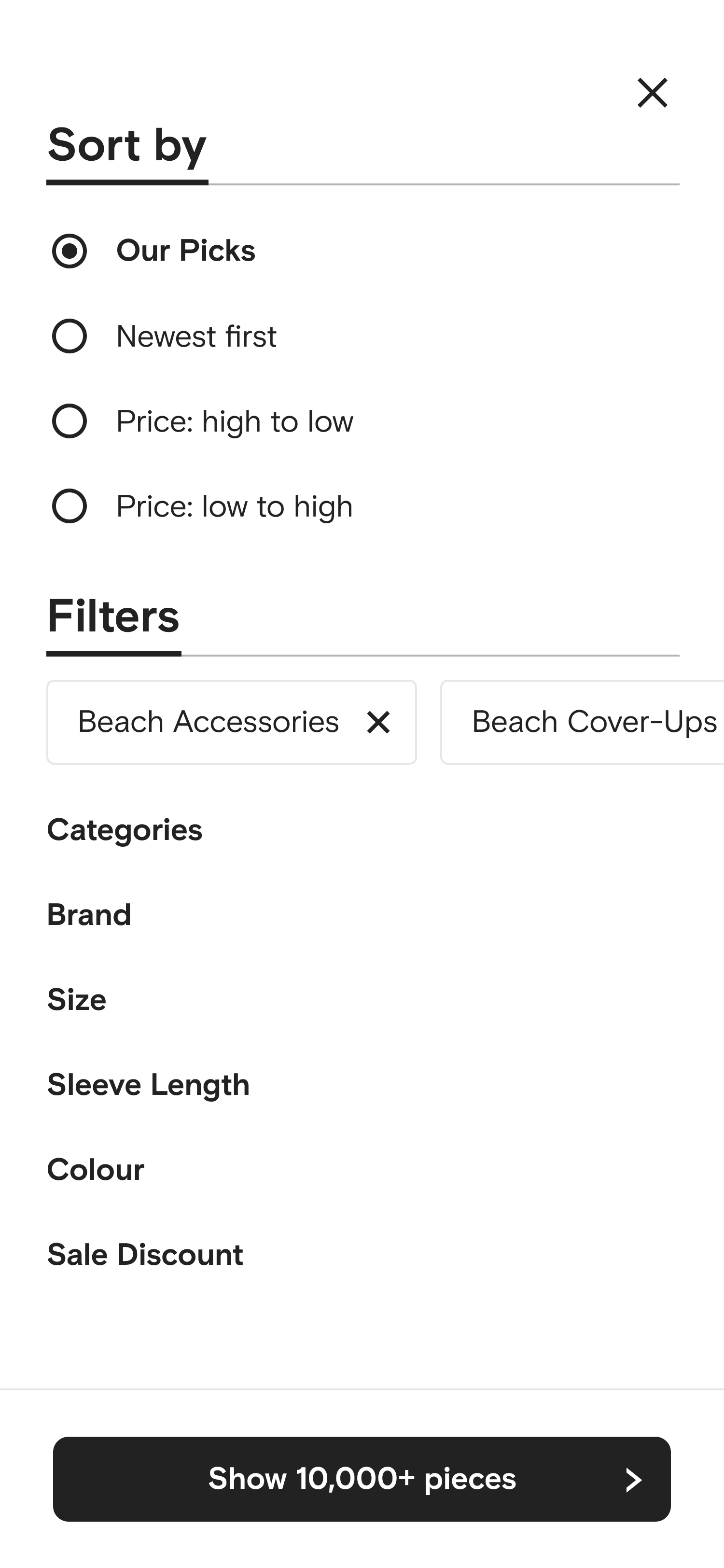 User selected Beachwear (single selection) , quick filters show Beachwear's subcategories